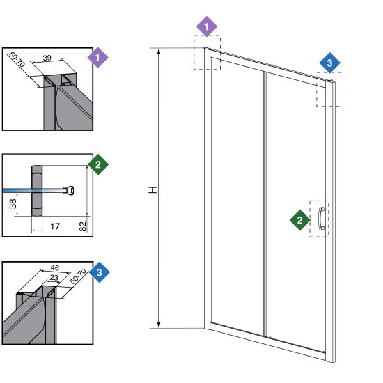 | Szerokość ścianki drzwi (C): | 442-462 mm, 492-512 mm, 542-562 mm, 642-662 mm |