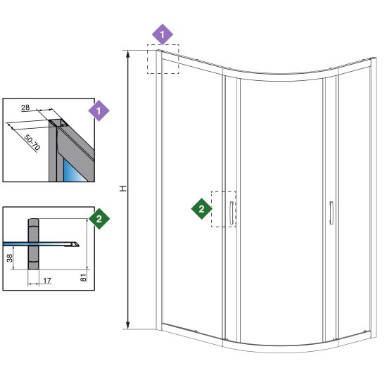 A - w przypadku montażu na brodziku weź pod uwagę wymiar A1 i A2 - jest to wymiar zewnętrzny pasującego brodzika.