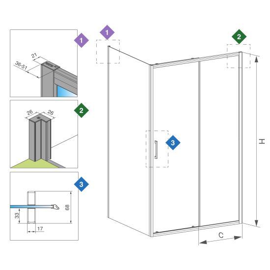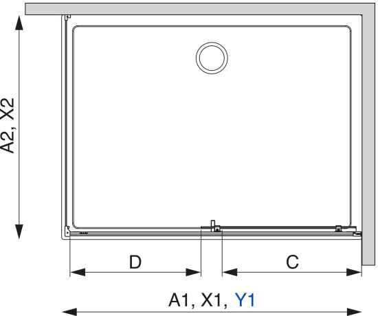 X - wymiar X1 i X2 to wymiar zewnętrzny kabiny (licząc od ściany do zewnętrznego obrysu profilu, zawiasu lub klamry). Jeśli chcesz, aby zewnętrzna krawędź profilu, zawiasu lub klamry kabiny była zamontowana na krawędzi płytek/fudze weź pod uwagę ten wymiar.