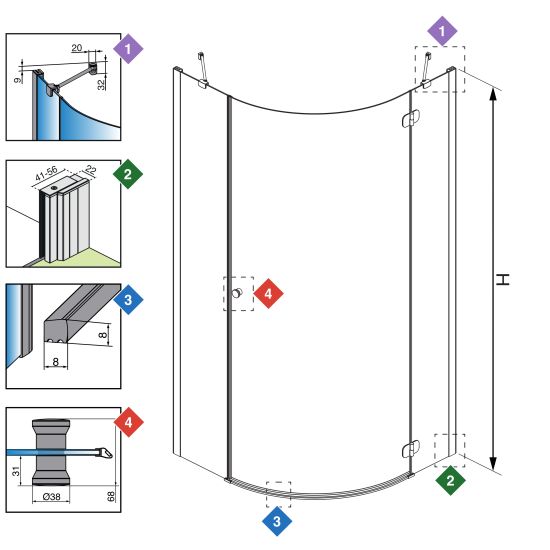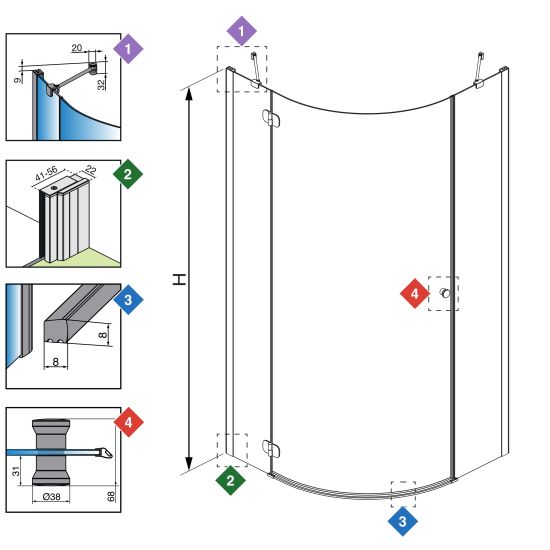 | Wymiar kabiny do osi szyby (Y1): | 770-785 mm, 870-885 mm |
