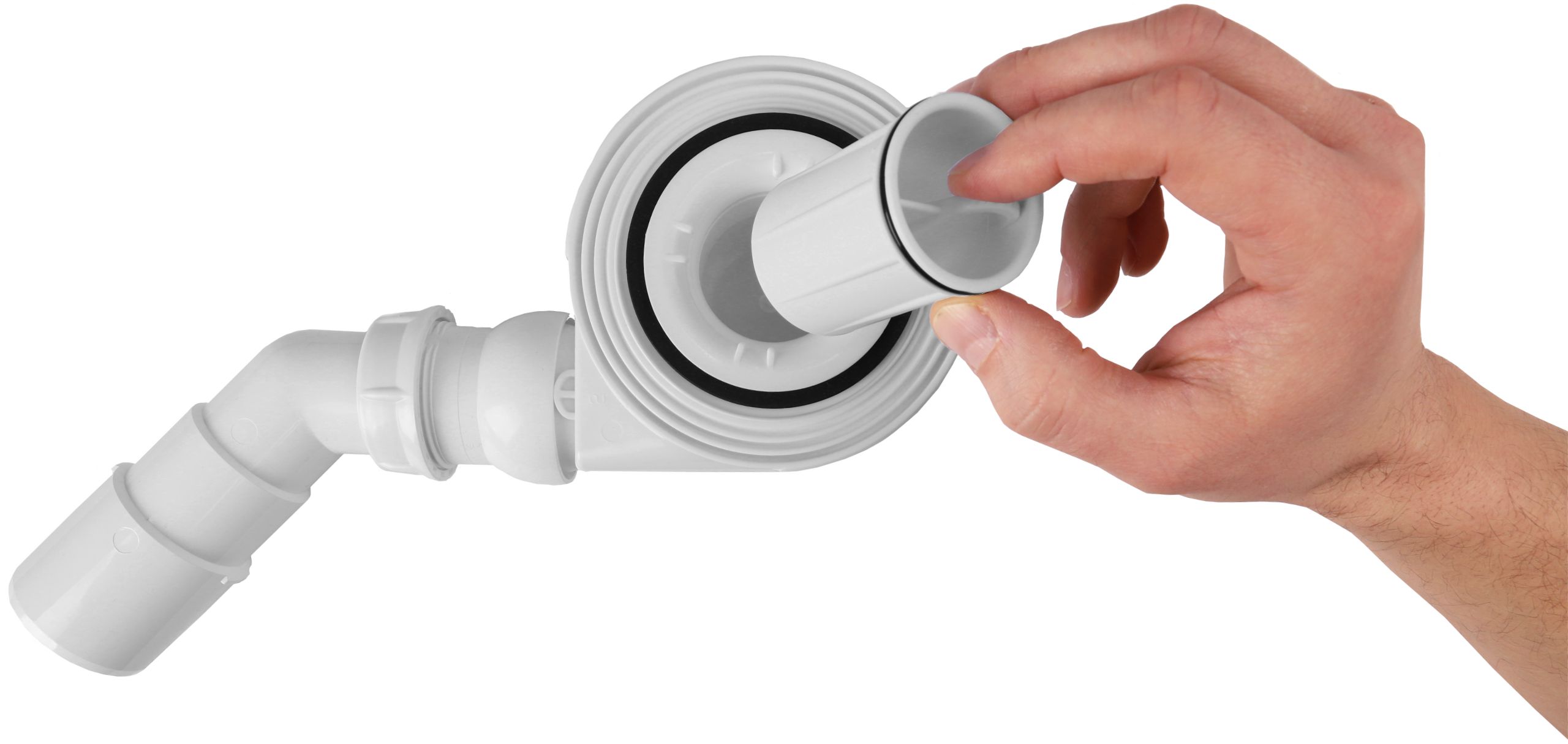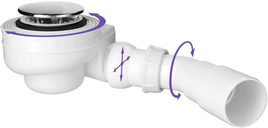 Budowa Radaway TB50 umożliwia niezwykle łatwe, wielokierunkowe pozycjonwanie syfonu w celu łatwego podłączenia do pionu kanalizacyjnego i ustawienia odpowiedniego spadu wody. Syfon można obracać zarówno w osi względem brodzika jak i regulować kąt kolanka przyłączeniowego względem całego syfonu. Takie rozwiązanie znacząco ułatwia pracę instalatora, pozwalając na szybkie i precyzyjne dostosowanie syfonu do indywidualnych warunków montażowych, nawet w trudnych lub ograniczonych przestrzeniach.