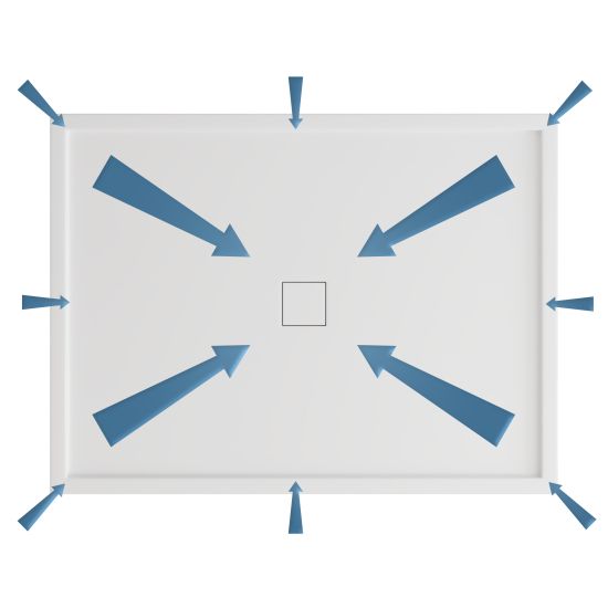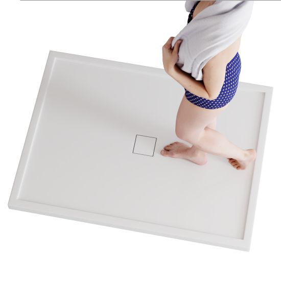 Brodzik został zaprojektowany z myślą o maksymalnej wygodzie i funkcjonalności codziennego użytkowania. Delikatne spady konstrukcyjne na powierzchni brodzika zapewniają szybkie i efektywne odprowadzanie wody do odpływu, zapobiegając jej gromadzeniu się na powierzchni. Precyzyjnie zaprojektowane nachylenie gwarantuje komfort natrysku bez wpływu na estetykę powierzchni — brodzik zachowuje elegancki, płaski wygląd. Delikatne spady występują także na krawędziach brodzika, na których wspiera się kabina prysznicowa, skutecznie chroniąc przed zatrzymywaniem się wody na styku elementów.