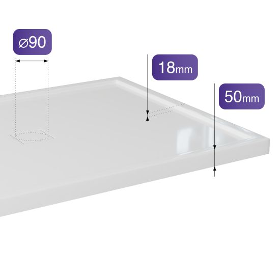Brodzik Geos D łączy w sobie nowoczesny wygląd i codzienną funkcjonalność. Wysokość całkowita 50 mm zapewnia łatwe wejście do strefy prysznicowej i lekkość aranżacyjną nawet w niewielkich łazienkach. Głębokość brodzika 18 mm gwarantuje wygodne korzystanie z natrysku, skutecznie chroniąc przed przelaniem się wody. Standardowa średnica odpływu 90 mm umożliwia szybkie i sprawne odprowadzanie wody oraz stosowanie syfonów z mechanizmem łatwego czyszczenia od góry. Płaska konstrukcja brodzika to idealne połączenie estetyki i komfortu użytkowania na co dzień.