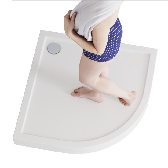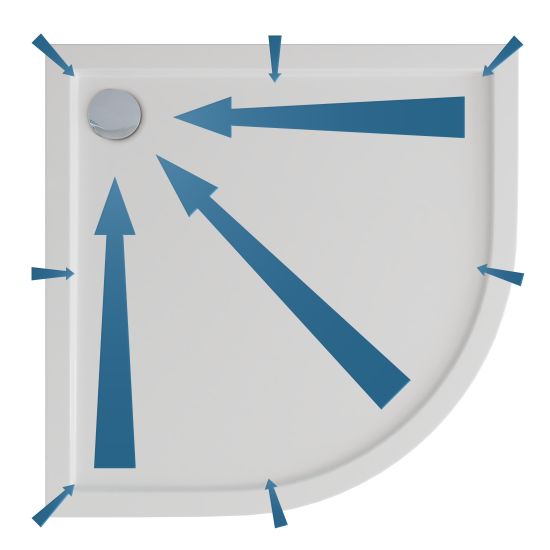 Brodzik został zaprojektowany z myślą o maksymalnej wygodzie i funkcjonalności codziennego użytkowania. Delikatne spady konstrukcyjne na powierzchni brodzika zapewniają szybkie i efektywne odprowadzanie wody do odpływu, zapobiegając jej gromadzeniu się na powierzchni. Precyzyjnie zaprojektowane nachylenie gwarantuje komfort natrysku bez wpływu na estetykę powierzchni — brodzik zachowuje elegancki, płaski wygląd. Delikatne spady występują także na krawędziach brodzika, na których wspiera się kabina prysznicowa, skutecznie chroniąc przed zatrzymywaniem się wody na styku elementów.