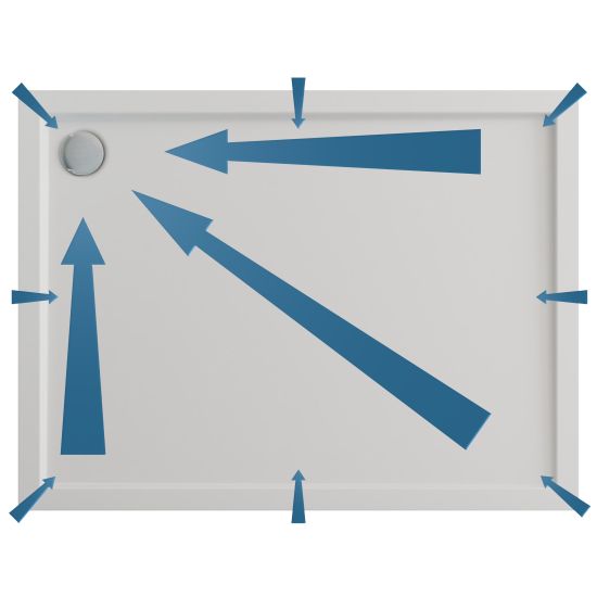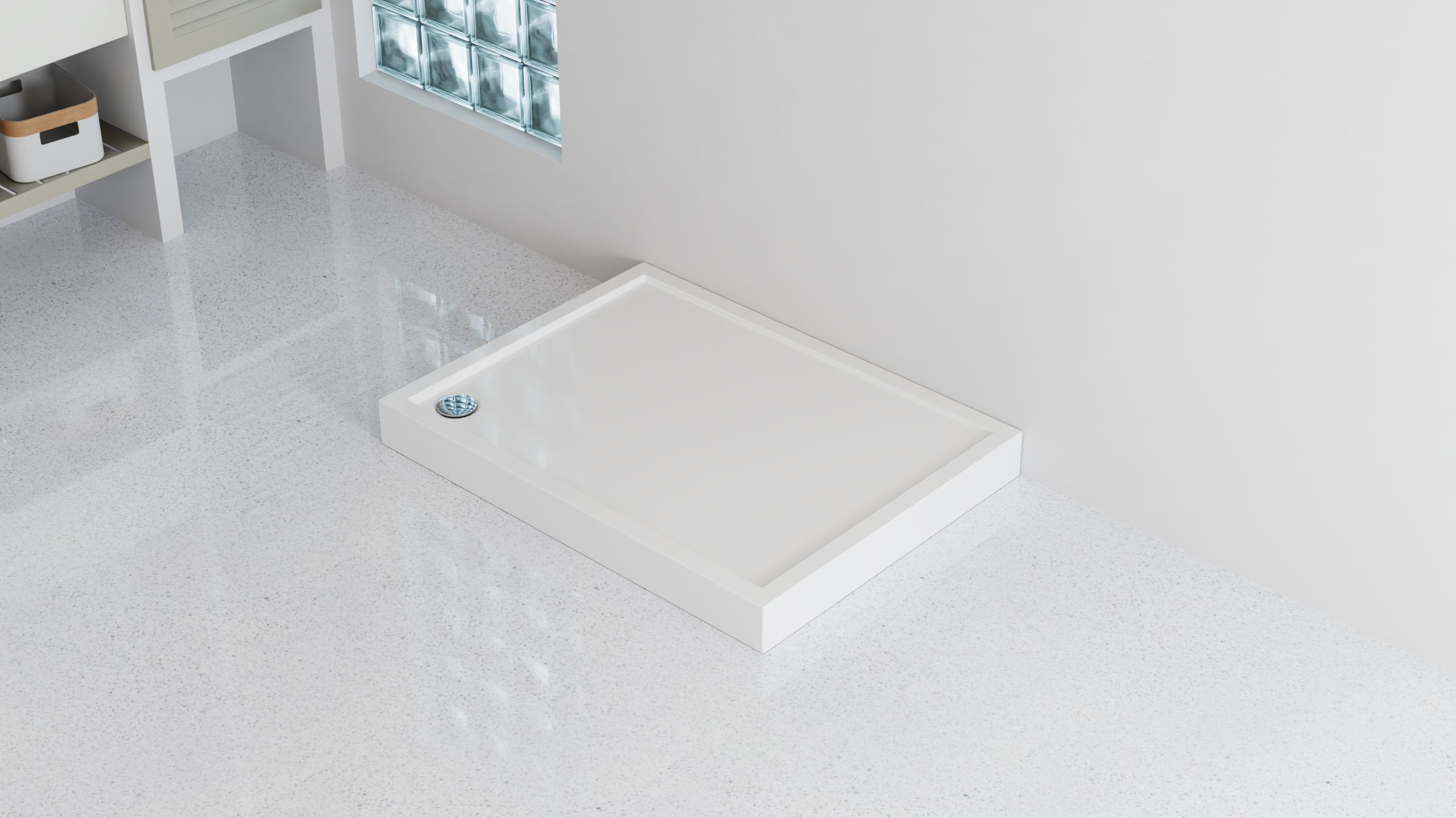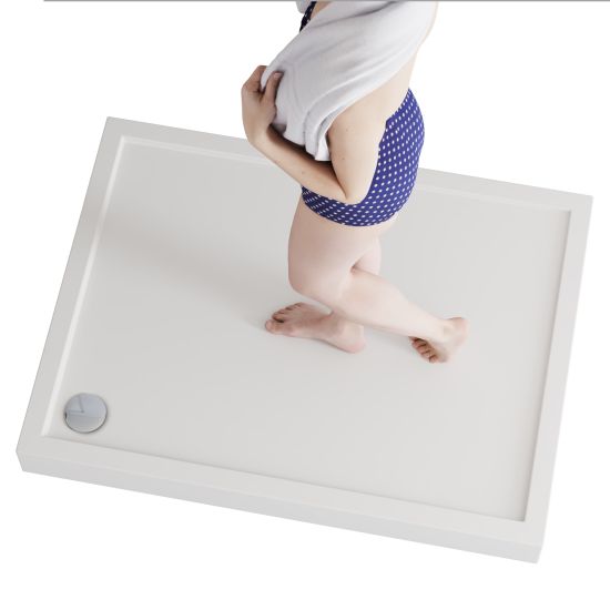 Brodzik został zaprojektowany z myślą o maksymalnej wygodzie i funkcjonalności codziennego użytkowania. Delikatne spady konstrukcyjne na powierzchni brodzika zapewniają szybkie i efektywne odprowadzanie wody do odpływu, zapobiegając jej gromadzeniu się na powierzchni. Precyzyjnie zaprojektowane nachylenie gwarantuje komfort natrysku bez wpływu na estetykę powierzchni — brodzik zachowuje elegancki, płaski wygląd. Delikatne spady występują także na krawędziach brodzika, na których wspiera się kabina prysznicowa, skutecznie chroniąc przed zatrzymywaniem się wody na styku elementów.