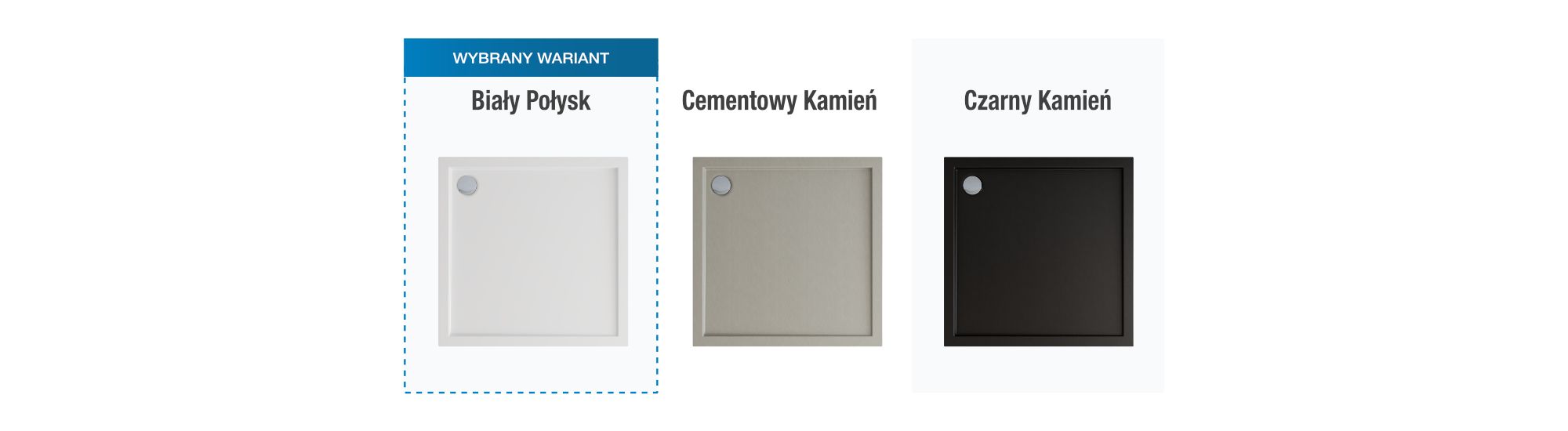 Brodzik Schedline Nivaro C dostępny jest - w zależności od rozmiaru - w trzech wariantach wykończenia: klasycznym białym połysku (RAL9003) oraz dwóch wykończeniach z elegancką strukturą kamienia: cementowy kamień (RAL7038) oraz czarny kamień (RAL9004).