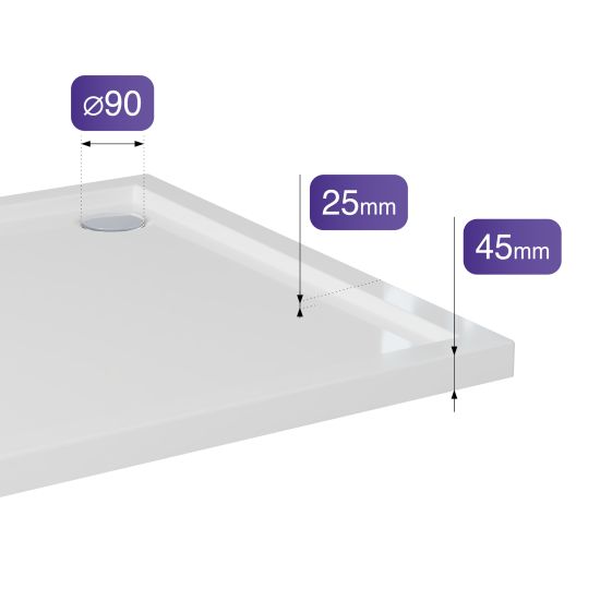 Brodzik Nivaro Ultra C łączy w sobie nowoczesny wygląd i codzienną funkcjonalność. Wysokość całkowita 45 mm zapewnia łatwe wejście do strefy prysznicowej i lekkość aranżacyjną nawet w niewielkich łazienkach. Głębokość brodzika 25 mm gwarantuje wygodne korzystanie z natrysku, skutecznie chroniąc przed przelaniem się wody. Standardowa średnica odpływu 90 mm umożliwia szybkie i sprawne odprowadzanie wody oraz stosowanie syfonów z mechanizmem łatwego czyszczenia od góry. Płaska konstrukcja brodzika to idealne połączenie estetyki i komfortu użytkowania na co dzień.