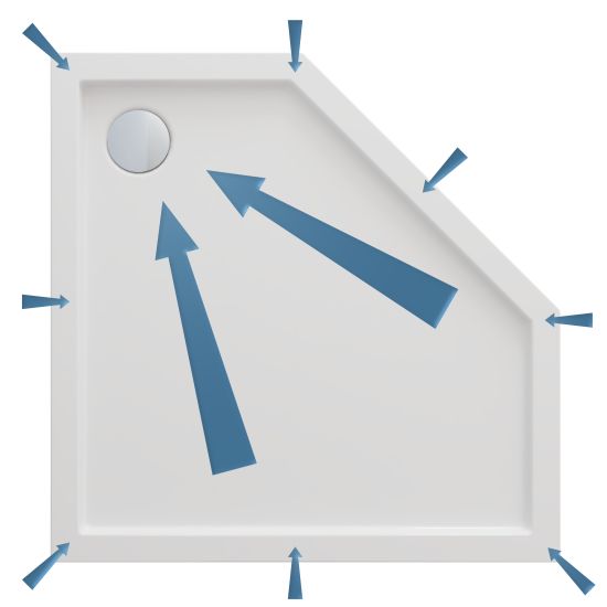 Brodzik został zaprojektowany z myślą o maksymalnej wygodzie i funkcjonalności codziennego użytkowania. Delikatne spady konstrukcyjne na powierzchni brodzika zapewniają szybkie i efektywne odprowadzanie wody do odpływu, zapobiegając jej gromadzeniu się na powierzchni. Precyzyjnie zaprojektowane nachylenie gwarantuje komfort natrysku bez wpływu na estetykę powierzchni — brodzik zachowuje elegancki, płaski wygląd. Delikatne spady występują także na krawędziach brodzika, na których wspiera się kabina prysznicowa, skutecznie chroniąc przed zatrzymywaniem się wody na styku elementów.