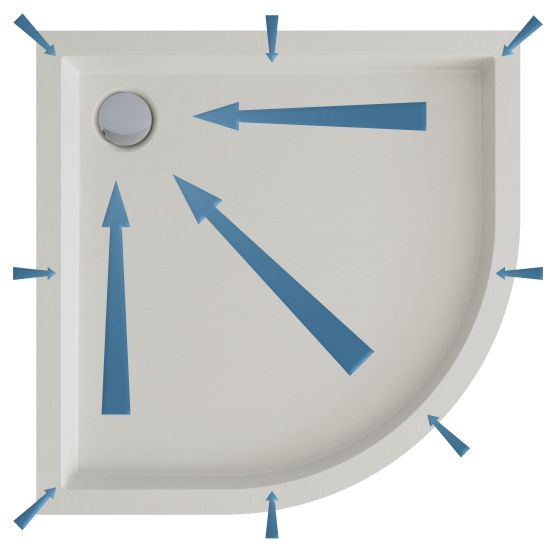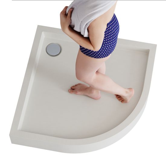 Brodzik został zaprojektowany z myślą o maksymalnej wygodzie i funkcjonalności codziennego użytkowania. Delikatne spady konstrukcyjne na powierzchni brodzika zapewniają szybkie i efektywne odprowadzanie wody do odpływu, zapobiegając jej gromadzeniu się na powierzchni. Precyzyjnie zaprojektowane nachylenie gwarantuje komfort natrysku bez wpływu na estetykę powierzchni — brodzik zachowuje elegancki, płaski wygląd. Delikatne spady występują także na krawędziach brodzika, na których wspiera się kabina prysznicowa, skutecznie chroniąc przed zatrzymywaniem się wody na styku elementów.