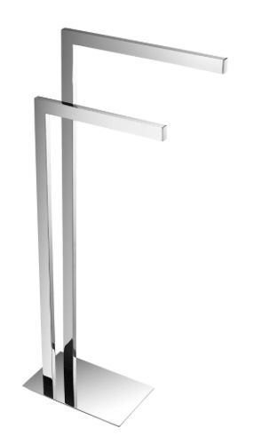 Funkcjonalny stojący wieszak na ręczniki, zintegrowany z prostokątną podstawą, odporny na korozję dzięki specjalnej chromowej powłoce.