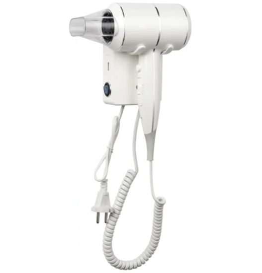 Suszarka do włosów z uchwytem przeznaczonym do montażu ściennego.