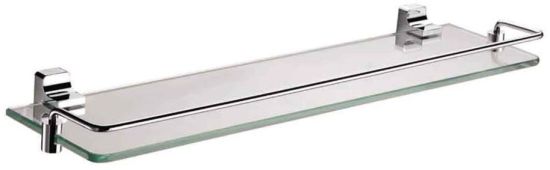 Nowoczesna półka łazienkowa, wykonana z mosiądzu i bezbarwnego szkła, stanowiąca funkcjonalne dopełnienie aranżacji łazienki.
