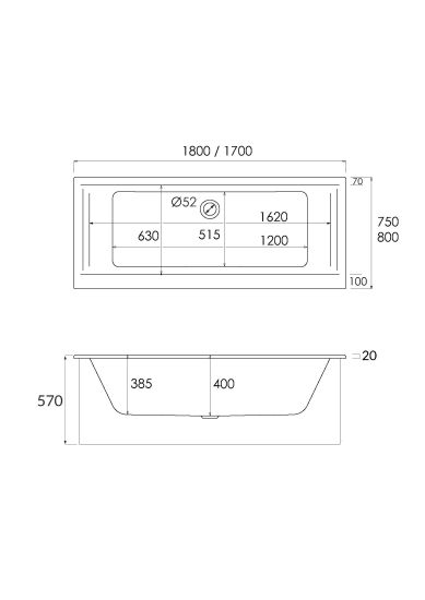 • prostokątna wanna akrylowa o średnicy odpływu 52 mm