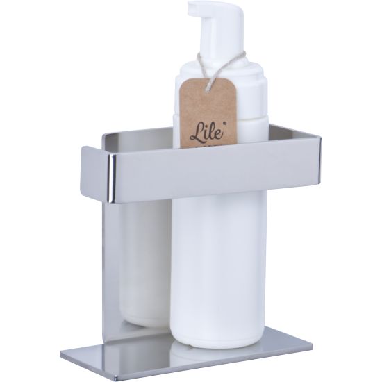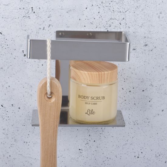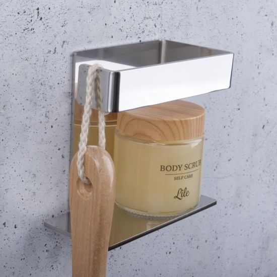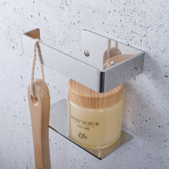 Nowoczesny wieszak pod prysznic, na którym bez problemu umieścisz żel pod prysznic i szampon.